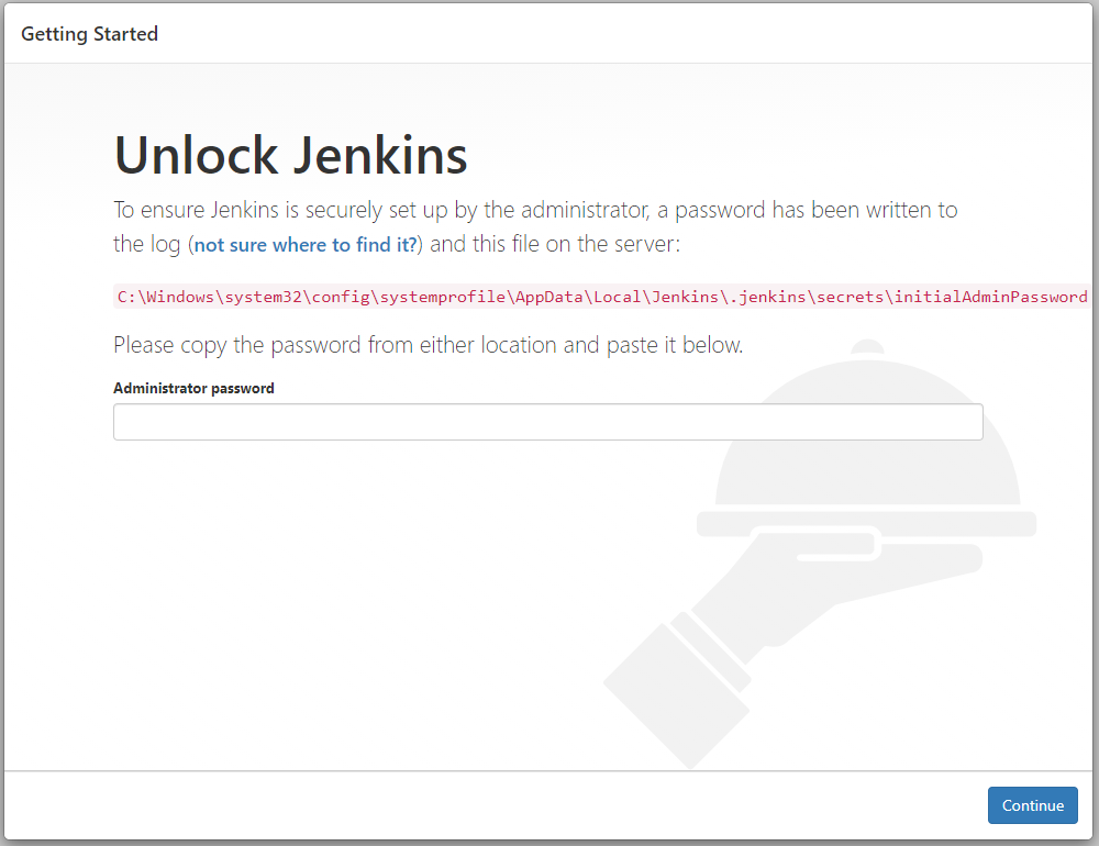 - 표시된 위치에 initialAdminPassword 파일 내의 값 입력 후 Continue