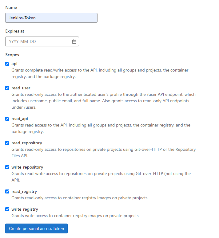 Scopes는 다 체크해주고, Expires at 은 미 설정 시 기한 제안 없은 토큰 생성