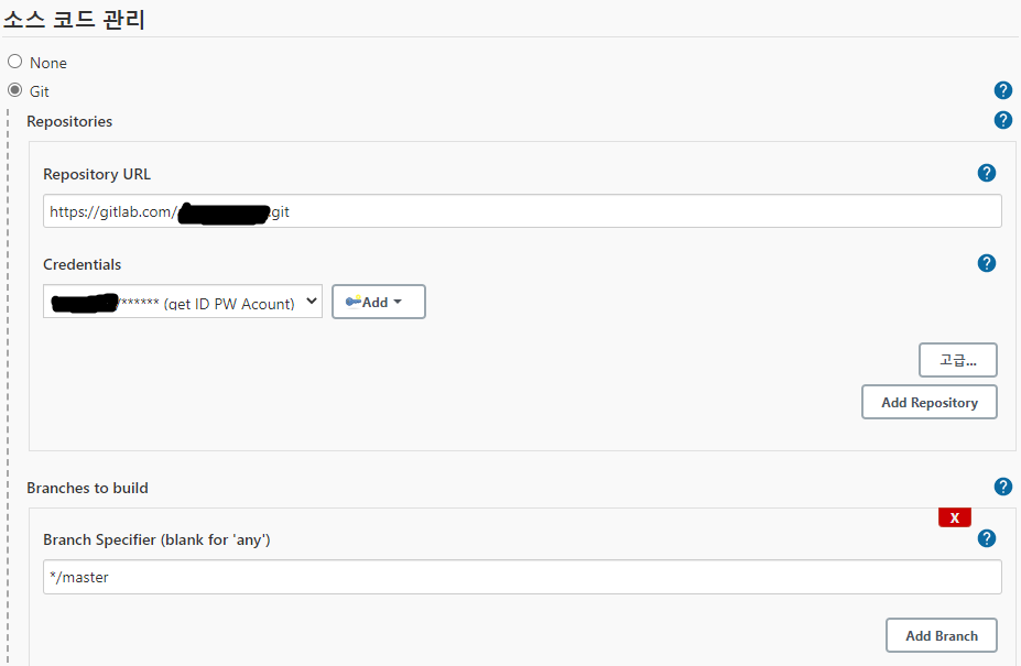 Credentials의 Add 눌러서 깃 계정 입력 하자(ID/PW 형태)